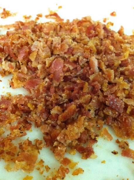 Step 5: Chop the crispy bacon into small pieces and add to the mixture. Beat for about a minute.