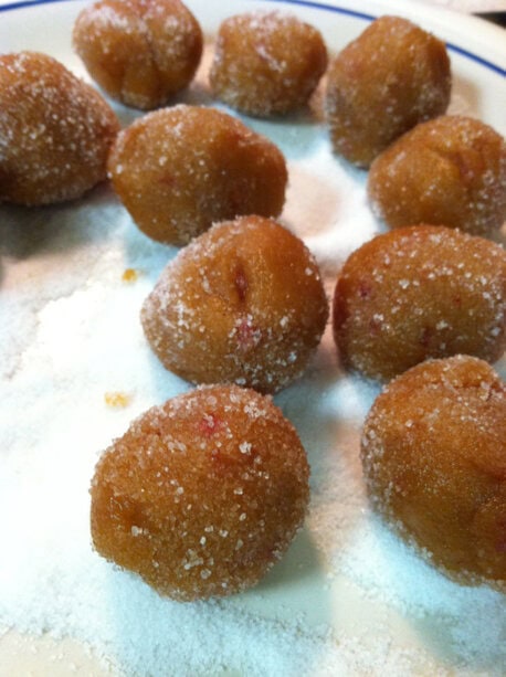 Step 6: Roll the dough into teaspoon-size balls. Again, I use the melon scooper for even cookies. The dough will feel a bit oily compared to normal chocolate chip cookie dough. Â This next step is optional, but adds a nice sweetness. Roll the cookie dough balls in the sugar and then put on a parchment lined cookie sheet.