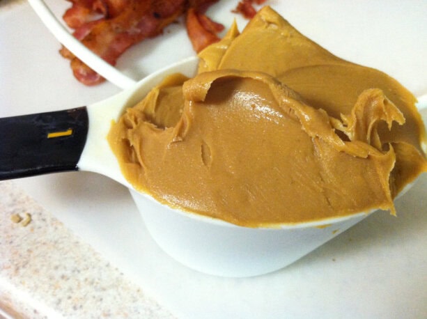 Step 3: Add in one cup of creamy peanut butter. Don’t use the all natural kind because it’s too oily and won’t get the dough to the right consistency. Also a helpful tip when dealing with peanut butter, spray the measuring cup first with some nonstick spray and that will help the peanut butter get out of the cup later on.