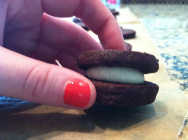 Step 10: Squeeze a dollop of frosting on every other cookie. Top with a non-frosted cookie and voila! Homemade Oreo deliciousness.