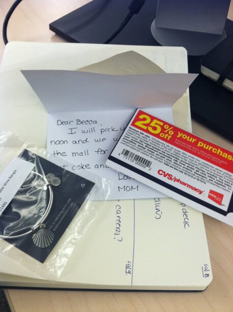 I did have two bright spots to my day today, that I feel I should call out so I’m not a total debbie downer. When I was younger my mom used to write me a doctors note to get me out of school so we could go to the mall and share a Cinnabon and Diet Coke. Those were the days. So today I got a package at work today from my mom … with a “doctors” note to go to the mall, a bracelet, and a CVS coupon. Then I got another package later in the day from one of my long-time friends from home who now works at Vineyard Vines. She sent me some VV pajama pants which I am rocking right now. So anyone else who wants to jump on this “send Becca gifts to work” bandwagon, feel free to get on that.