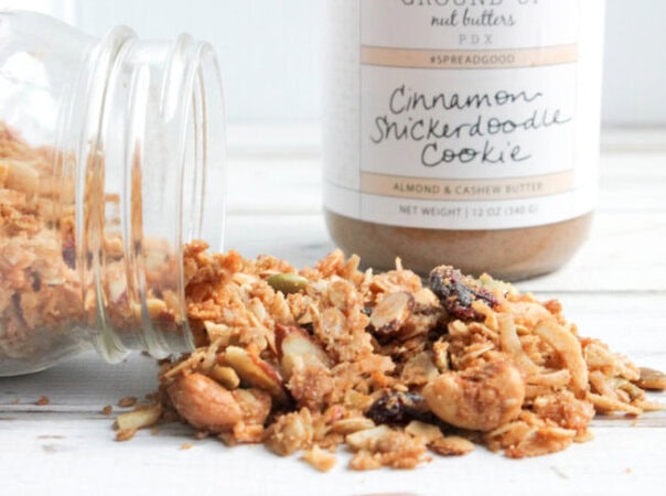 Happy New Year! I figure we might as well start off 2017 with a bit of a cookie detox, which I am sure we all need after the holidays. And what better way to start off the new year and your morning than with some delicious homemade granola. This recipe for Snickerdoodle Almond Butter Granola was a happy experiment inspired by a jar of Cinnamon Snickerdoodle Almond + Cashew butter that I received last month from my friend over at Ground Up PDX. I have a good base granola recipe that I like to experiment with, and was looking for something sweet, salty and full of cinnamon flavor. Snickerdoodle has been one of my favorite flavors for a long time – both in cookies and coffee – so it seemed like the perfect flavor for a sweet and salty homemade granola.