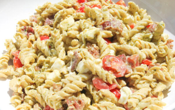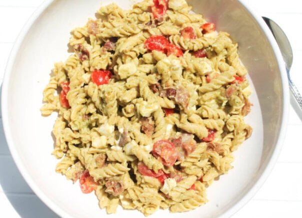 So the next time you’re looking to bring a gluten-free side dish or if you just want to try your hand at a gluten free recipe that doesn’t taste like chewed cardboard, definitely whip up a batch of this super simple Gluten Free Basil Pesto Pasta Salad. Enjoy!