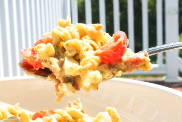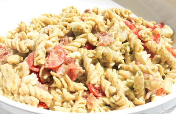 It was not until I recently discovered Banza chickpea pasta that I became a complete convert over to gluten-free pasta. Their pasta is 90% chickpeas, and a serving has 25g of protein, 13g fiber and half the net carbs of regular pasta. With all my weird stomach issues these days, I often try to cook a few dinners every week without meat, and when I do I always feel better using Banza pasta because I’m getting a good amount of protein without the meat. Of course you can make this pasta salad with any brand of pasta, gluten-free or gluten-filled, it’s up to you. You can also modify the “add-ins” to your preference as well, like cucumber, carrots, salami, whatever your stomach desires. We found that this stays for up to 3 days in the fridge (that is, if there are actually leftovers) and if I am making it a night in advance then I do the pasta, pesto + mayo, and then add in the tomatoes, bacon and cheese right before I serve it. The amount of pesto + mayo you add in is really up to preference, so it’s really not an exact science. If you like a creamier pasta salad, add more mayo. If you want to serve this warm, I recommend more pesto and maybe even omit the mayo.