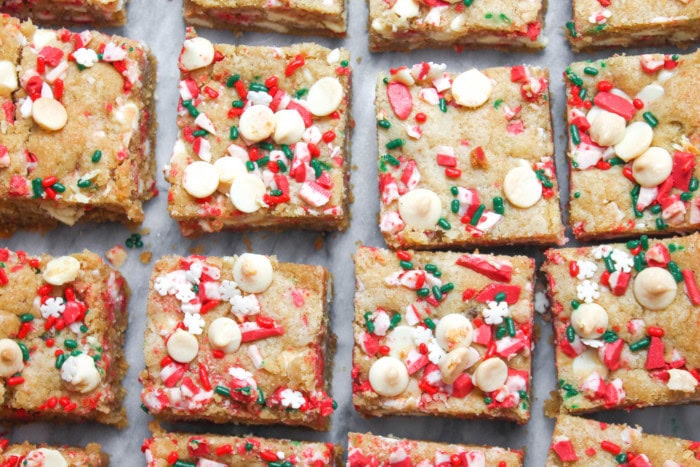 It’s officially December, which means it’s officially socially acceptable to eat cookies with every single meal until we all make our Jan 1 resolutions to workout and burn off all those cookies. If you’re feeling stressed out about the holidays, I don’t think you’re alone. With Thanksgiving being the latest possible date this year, it feels like we’re rushing straight into the Christmas holidays – decorating, baking, and even Mother Nature trying to force this mini snowstorm in today. I’ve taken advantage of the cold weather and everyone else traveling this weekend to get a head start on my holiday decorating and baking. This is the fifth year I’ve hosted The Salted Cookie Holiday Cookie Swap, where friends and friends of friends all get matched to send and receive one recipe. This is our biggest year yet with almost 30 participants. Originally I was going to make a version of my peppermint sprinkle cookies and whip up some peppermint frosting to make mini oreo-like sandwich cookies. I might still make those later this month, but I needed something that was going to hold up better in the mail, so I adapted my Salted Candy Bar Blondies recipe to peppermint it up for the holidays.